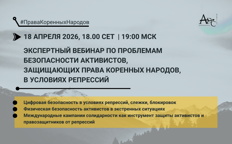 18 апреля 2026 года 18:00 по европейскому времени (CET) | 19:00 по московскому времени Приглашаем заинтересованных слушателей на очередной экспертный вебинар, организованный АДЦ «Мемориал» в партнерстве с Международным комитетом коренных народов России (ICIPR) по актуальным вопросам защиты прав коренных народов. В...Заявление Антидискриминационного Центра «Мемориал» против политических репрессий мемориальцев