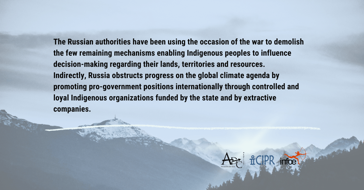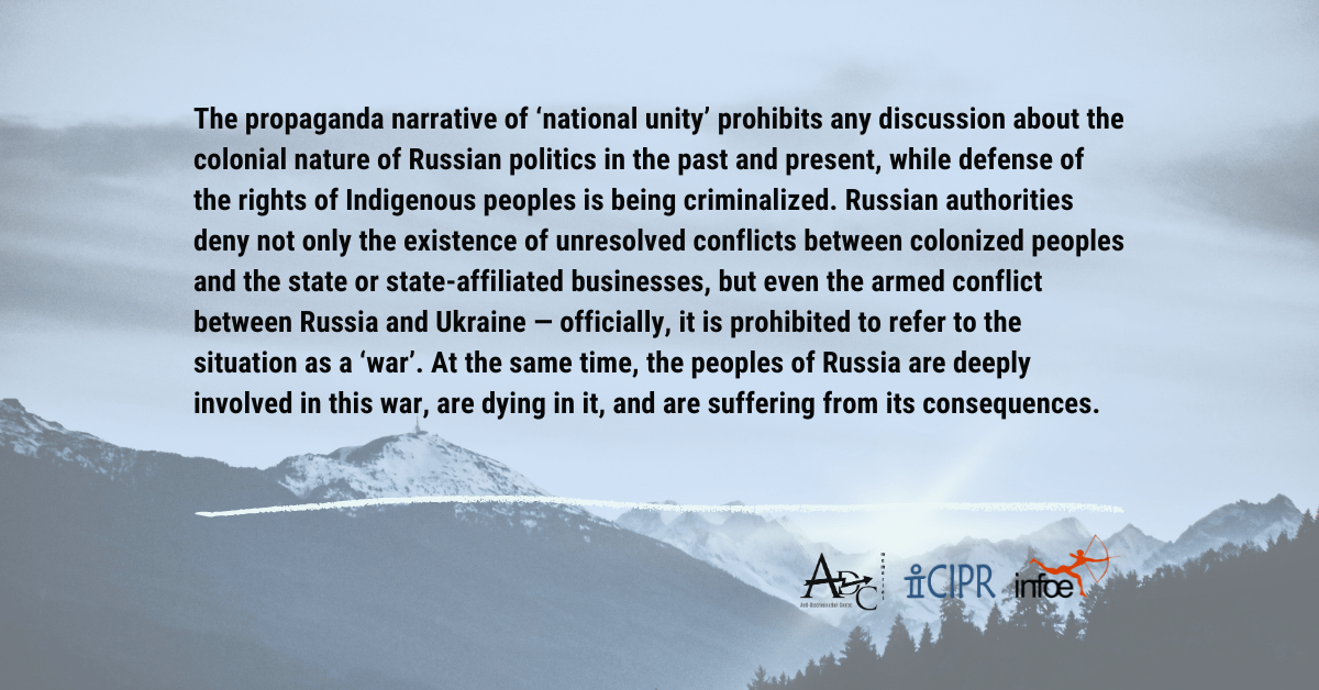 ADC Memorial – Brussels, the International Committee of Indigenous Peoples of Russia, and the Institut für Ökologie und Aktions-Ethnologie have prepared a input for the UN Expert Mechanism on the Rights of Indigenous Peoples, focusing on the situation of indigenous peoples in armed conflict and post-conflict situations in the context of the Russian Federation’s military aggression against Ukraine.