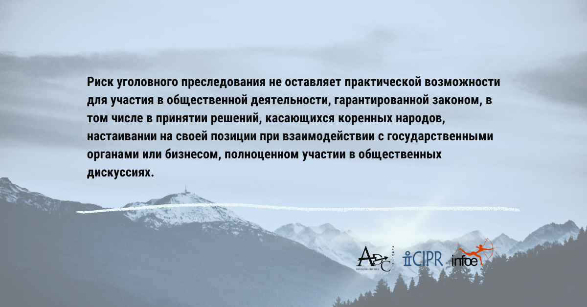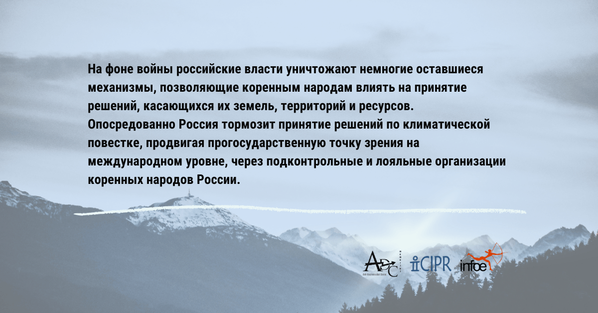 На фоне войны российские власти уничтожают немногие оставшиеся механизмы, позволяющие коренным народам влиять на принятие решений, касающихся их земель, территорий и ресурсов. Так, новое положение позволяет проводить экологические экспертизы только аккредитованным экспертам, выбранным произвольно, что практически исключает любые независимые мнения. В отсутствие правовых возможностей, и, что наиболее важно, признания коренных народов в качестве коллективных правообладателей, имеющих неотъемлемые права на свои земли, территории и ресурсы, в условиях разгромленного гражаднского общества и в атмосфере страха и запугивания, созданной в России еще до начала полномасштабной агрессии, ни один критик промышленных проектов не может чувствовать себя в безопасности, и очень маловероятно, что такая критика может быть должным образом зафиксирована и доведена до сведения общественности.